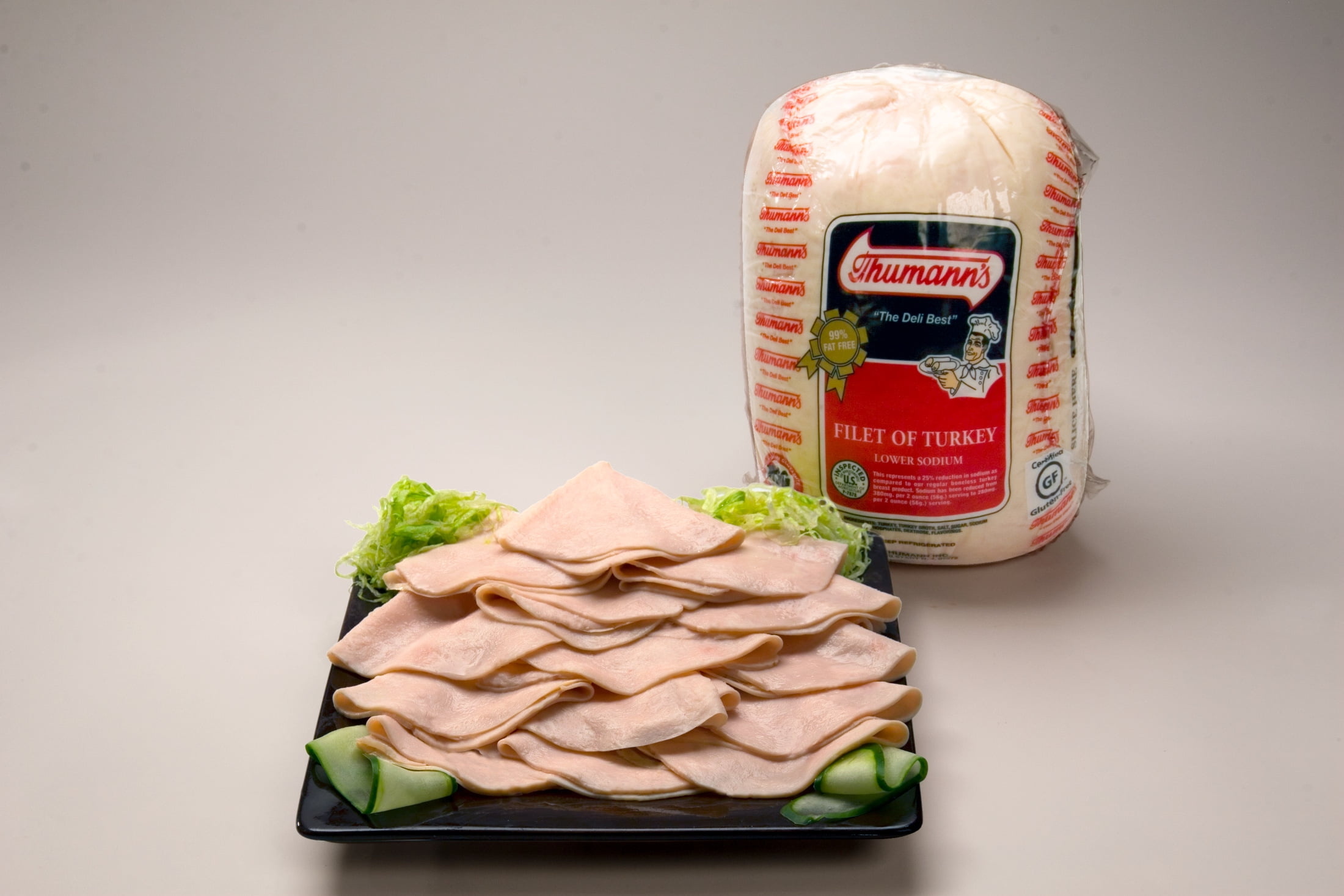 Our Thumann’s Lower Sodium Plain Turkey Breast starts as all our Turkey cold cuts do — we take the leanest turkey breasts, which are expertly trimmed by our team of master butchers. These breasts are cooked and lightly smoked to retain the pure turkey flavor while bringing out complex flavors associated with these methods of cooking. The result is a straightforward turkey cold cut, rich in flavor and a great base for any meal. This version of our plain turkey is produced using less sodium than our regular turkey products. Like most Thumann products, it is Certified Gluten Free, has No MSG Added, Contains No Artificial Flavors or Colors, No Fillers, and No Trans Fats. All of our products are wrapped in plastic.