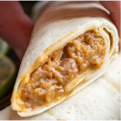 Hearty ground beef, pinto beans filling stuffed in a fresh baked tortilla