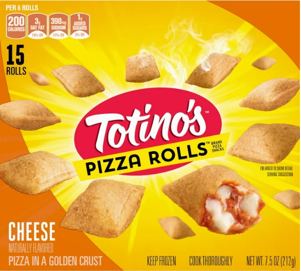 CONTAINS: One 7.5 oz package of Totino's Cheese Flavored Pizza Rolls; 15 count; About 2.5 servings