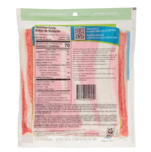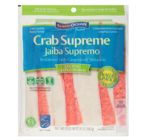 TransOcean's Crab Supreme imitation crab legs are an easy way to enjoy healthy and delicious seafood the easy way. Ready-to-use in fresh seafood ceviche, seafood salads, crab dips, sushi rolls or hot dishes, TransOcean Crab Supreme is a great tasting addition to your favorite seafood recipes. It's also a tasty snack that you can eat right out of the bag with a dipping sauce or dressing, and has 5g of protein per serving. By being fat free, low in cholesterol, gluten free and heart healthy, Crab Supreme makes it easier to maintain a healthy diet. Made from MSC-certified sustainable, wild Alaska Pollock and Pacific Whiting with real crab meat added, TransOcean's Crab Supreme is a convenient, low cost alternative to more expensive crab, lobster, shrimp and scallops. 1 - 20 oz medium plastic bag.