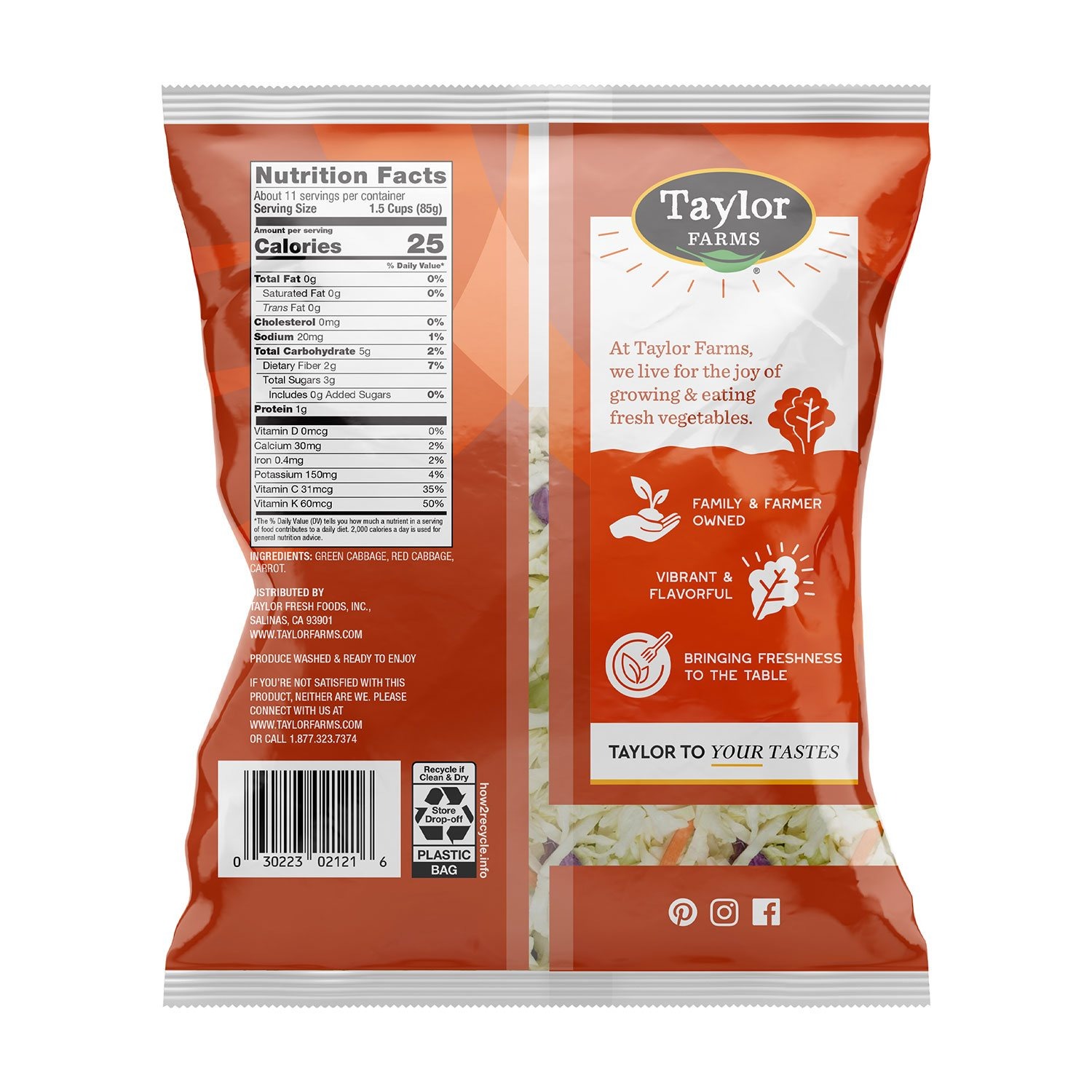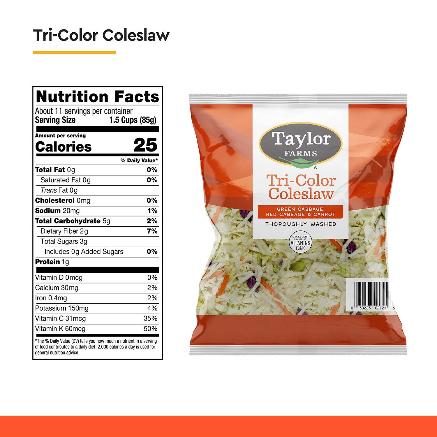 The Tri-color Coleslaw is a vibrant mix of raw green cabbage, red cabbage, and shredded carrots. This blend not only adds a splash of color to your dishes but also packs a nutritional punch. With only 20 calories per serving, it provides 2 grams of fiber, 1 gram of protein, and 50% of your daily recommended amount of vitamin C. This blend can be added directly to stir-fries or salads for a crunchy twist or used to whip up a classic coleslaw salad.