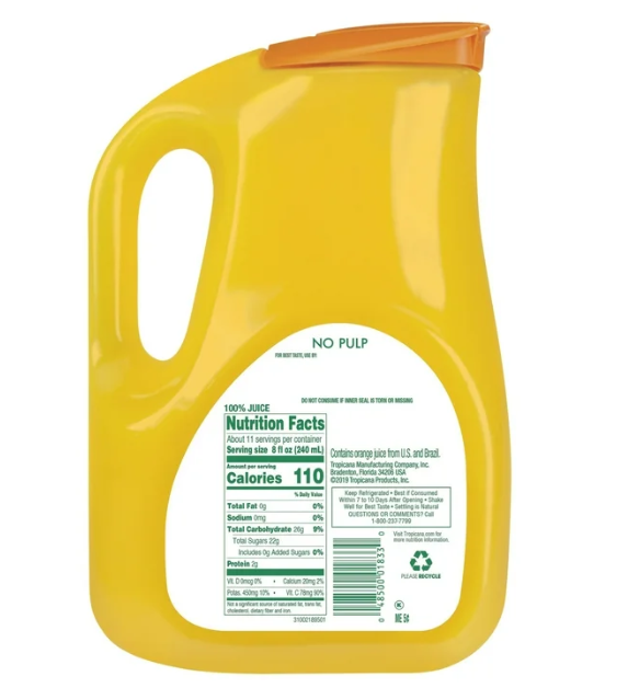 Tropicana Pure Premium No Pulp Original Orange Juice 89 Fl Oz Bottle. The perfect combination of taste and nutrition! Tropicana Pure Premium Pure Premium Original is 100% pure orange juice, squeezed from fresh-picked oranges and never from concentrate. No wonder it's the #1 orange juice brand. 100% orange juice that's squeezed from fresh oranges. Tropicana uses the best in fruit to craft high quality juices, beverages and drinks that provide delicious flavor choices. We make real juice from real fruit. Our colors are vibrant and our taste is too—each sip is a bright, mouthwatering "pop" of flavor.
