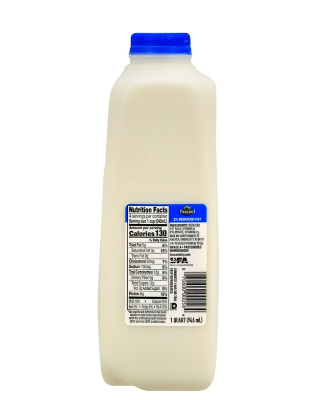 One (1) quart milk bottle of Tuscan Dairy Farms 2% Reduced Fat Milk with Vitamin A and Vitamin D