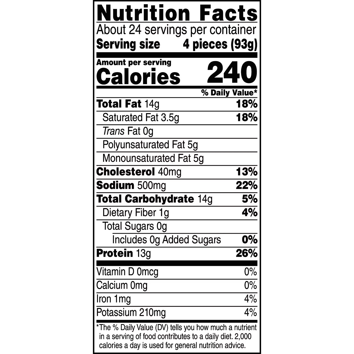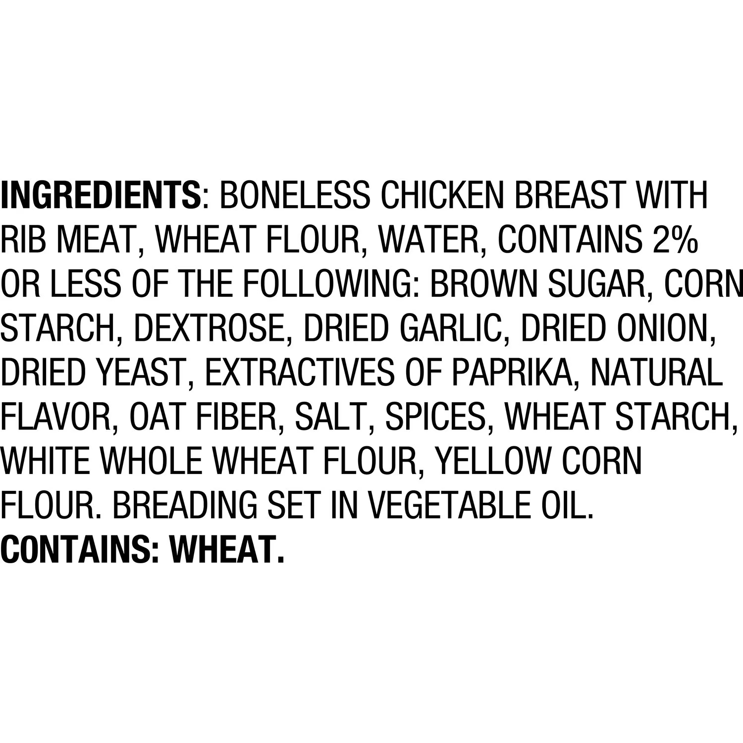 Ingredients: White Meat Chicken, Wheat Flour, Water, Contains 2% Or Less Of The Following: Brown Sugar, Corn Starch, Dextrose, Dried Garlic, Dried Onion, Dried Yeast, Extractives Of Paprika, Natural Flavor, Salt, Soybean Oil, Spices, Wheat Starch, White Whole Wheat Flour, Yellow Corn Flour, Breading Set In Vegetable Oil.
