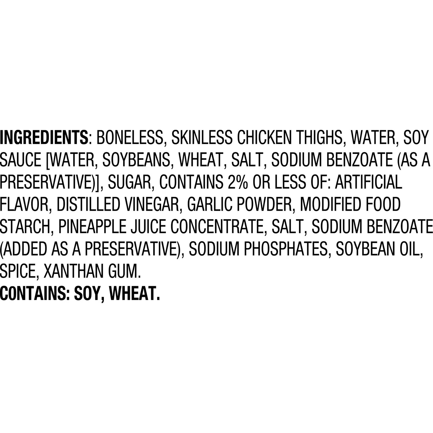 Ingredients: Boneless Skinless Chicken Thighs, Water, Soy Sauce (Water, Soybeans, Wheat, Salt, Sodium Benzoate [As A Preservative]), Sugar, Contains 2% Or Less Of The Following: Artificial Flavor, Distilled Vinegar, Garlic Powder, Modified Food Starch, Pineapple Juice Concentrate, Salt, Sodium Benzoate (Added As A Preservative), Sodium Phosphates, Soybean Oil, Spice, Xanthan Gum.