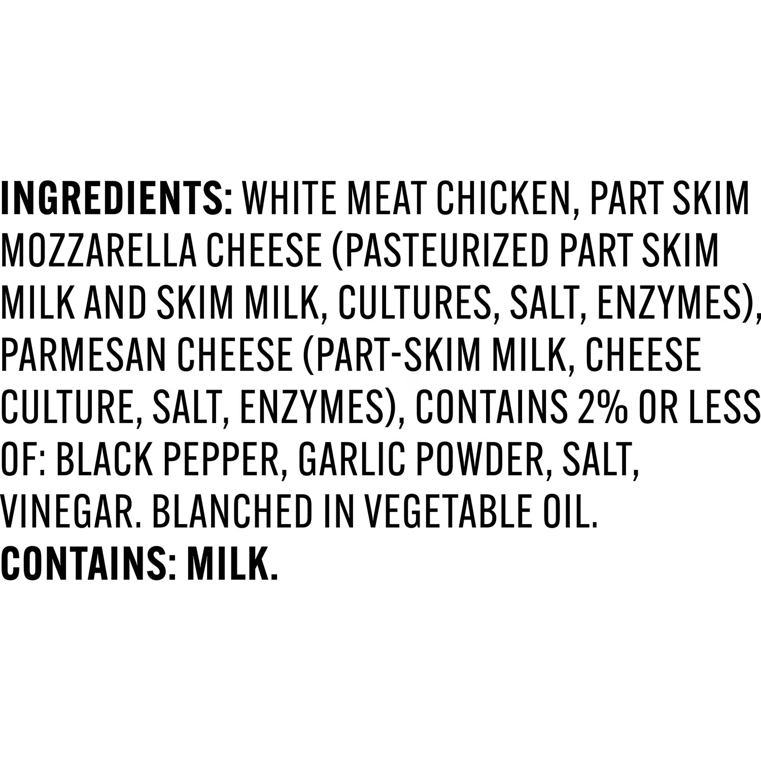 Ingredients: White Meat Chicken, Part Skim Mozzarella Cheese (Pasteurized Part Skim Milk And Skim Milk, Cultures, Salt, Enzymes), Parmesan Cheese (Part-Skim Milk, Cheese Culture, Salt, Enzymes), Contains 2% Or Less Of: Black Pepper, Garlic Powder, Salt, Vinegar. Blanched In Vegetable Oil.