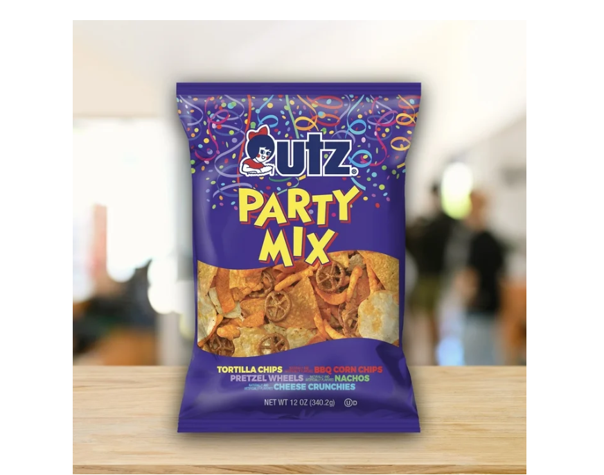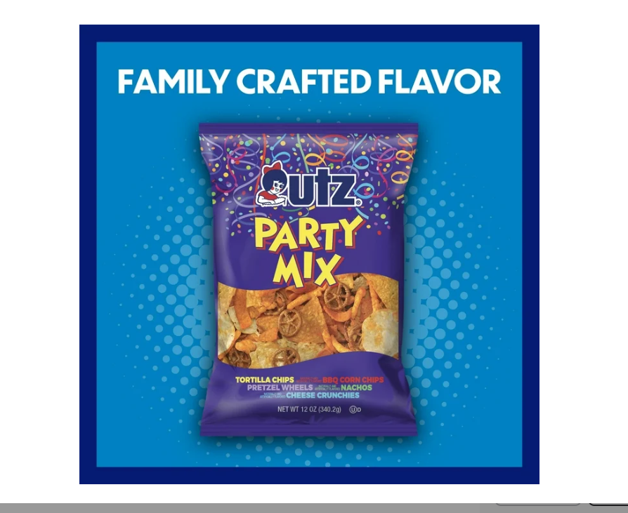 Utz Party Mix is a delicious snack mix in a 12 oz bag, featuring crunchy pretzel wheels, zesty nachos, savory BBQ corn chips, cheese curls, and tortilla chips. Perfect for parties, movie nights, tailgates, or anytime snacking. Made with Utz's signature family-crafted flavor and kosher certified.