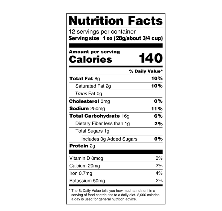 Cheesier Nacho Tortillas: Corn, Vegetable Oil (Corn, Cottonseed, or Sunflower), Whey, Maltodextrin, Salt, Buttermilk Solids, Cheese (Parmesan [Part-Skim Milk, Cheese Culture, Salt, Enzymes], Cheddar [Pasteurized Milk, Cheese Culture, Salt, Enzymes]), Tomato, Onion, Enzyme Modified Cheese (Cheddar Cheese [Pasteurized Milk, Cheese Culture, Salt, Enzymes], Disodium Phosphate, Enzymes, Xanthan Gum), Natural Flavor, Butter, Garlic, Spice, Yellow #5, Yellow #6, Yellow #5 Lake, Yellow #6 Lake, Red #40 Lake, Silicon Dioxide, Sodium Phosphate, Citric Acid, Disodium Inosinate, Disodium Guanylate.