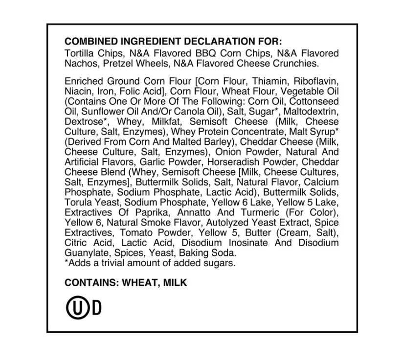 BBQ Corn Chips:Enriched Ground Corn (Corn Flour, Lime, Niacin, Reduced Iron, Thiamine Mononitrate, Riboflavin and Folic Acid), Vegetable Oil (Corn and/or Cottonseed), Dextrose, Salt, Sugar, Corn Flour, Torula Yeast, Onion and Garlic Powders, Horseradish Powder, Tomato Powder, Natural Coloring (includes Extractives of Paprika, Annatto and Turmeric), Spice Extractives, Natural Smoke Flavor.Crunchy Cheese Curls:Corn Meal, Vegetable Oil (Contains one or more of the following: Cottonseed, Corn, Canola, Sunflower, Safflower), Maltodextrin, Whey, Cheddar Cheese [(Pasteurized Milk, Cheese Cultures, Salt, Enzymes), Whey, Salt, Disodium, Phosphate, Lactic Acid, Artificial Color (Including, Yellow #5 and Yellow #6)], Salt, Dehydrated Shortening (Soybean and/or Coconut Oil, Corn Syrup Solids, Sodium Caseinate, Mono and, Diglycerides, Tocopherols), Natural and Artificial Flavors, Sour Cream (Cultured Cream, Nonfat Milk), FD &C Yellow Lake #5, FD&C Yellow Lake #6, Lactic Acid, Autolyzed Yeast Extract, Citric Acid, Disodium Inosinate and Disodium Guanylate, Vitamin A Palmitate.Wheel Pretzels:Wheat Flour, Salt, Corn Oil, Malt Syrup, Sugar, Yeast, Soda.Cheesier Nacho Tortillas:Corn, Vegetable Oil (Contains one or more of the following: Corn, Cottonseed, or Sunflower), Whey Maltodextrin, Salt, Buttermilk Solids, Cheese (Parmesan [Part-Skim Milk, Cheese Culture, Salt, Enzymes], Cheddar [Pasteurized Milk, Cheese Culture, Salt, Enzymes]), Tomato, Onion, Enzyme Modified Cheese (Cheddar Cheese [Pasteurized Milk, Cheese Culture, Salt, Enzymes], Disodium Phosphate, Enzymes, Xanthan Gum), Natural Flavor, Butter, Garlic, Spice, Yellow #5, Yellow #6, Yellow #5 Lake, Yellow #6 Lake, Red #40 Lake, Silicon Dioxide, Sodium Phosphate, Citric Acid, Disodium Inosinate, Disodium Guanylate.Tortilla Chips:Corn, Vegetable Oil (Contains one or more of the following: Corn, Cottonseed, or Sunflower), Sa