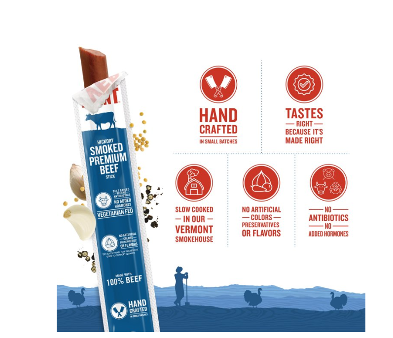Get smart with your snacking with these Hickory Smoked Premium Beef 1oz snack sticks from Vermont Smoke & Cure. Our individually wrapped beef sticks are the stick for those who love beef forward flavors: fresh pepper and naturally smoked hardwood flavor combine for a classic, meat forward RIBEYE taste that you will be surprised fits in a snack format. These beef and pork sticks are perfect for weekly lunches or throw one in your bag for those busy days when you're on the go. Free from Top 9 Allergens.
