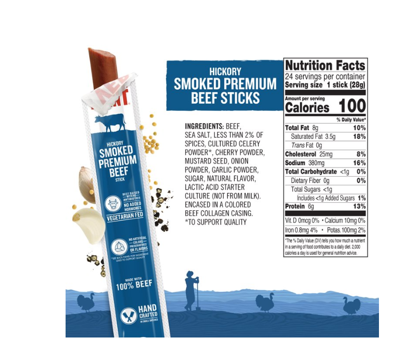 PROTEIN MEAT STICK - 1oz meat stick is a 100-calorie snack, 6g of protein and 1g of Carbs