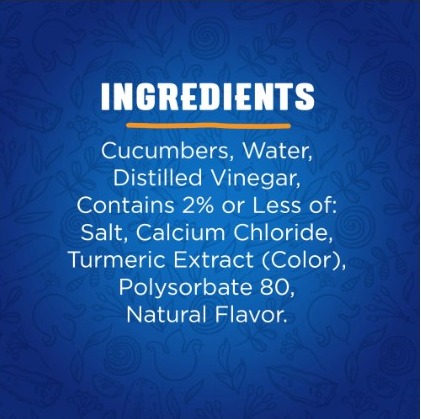 Cucumbers, Water, Distilled Vinegar, Less than 2% of: Salt, Calcium Chloride, Polysorbate 80, Natural Flavor, Turmeric Extract (Color)