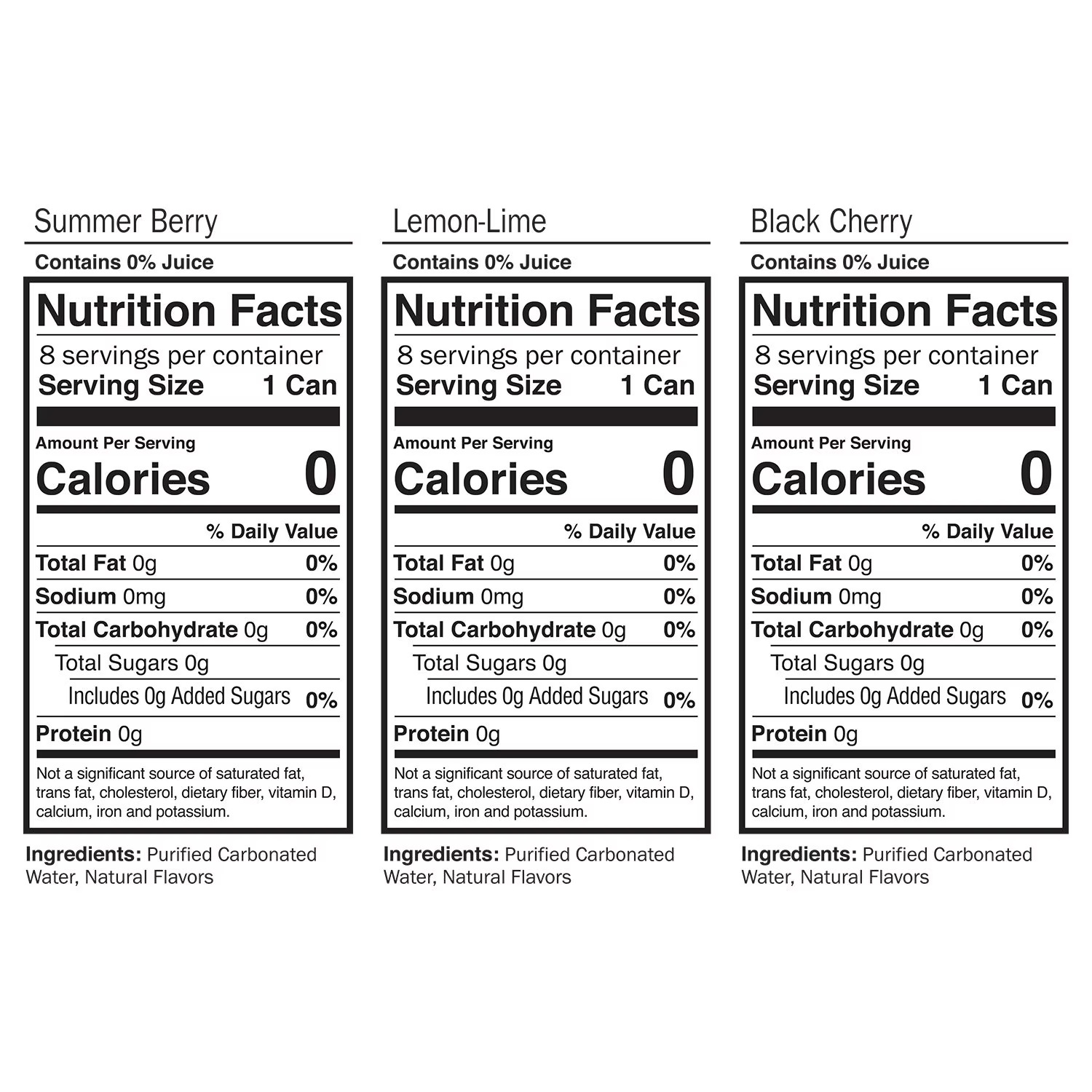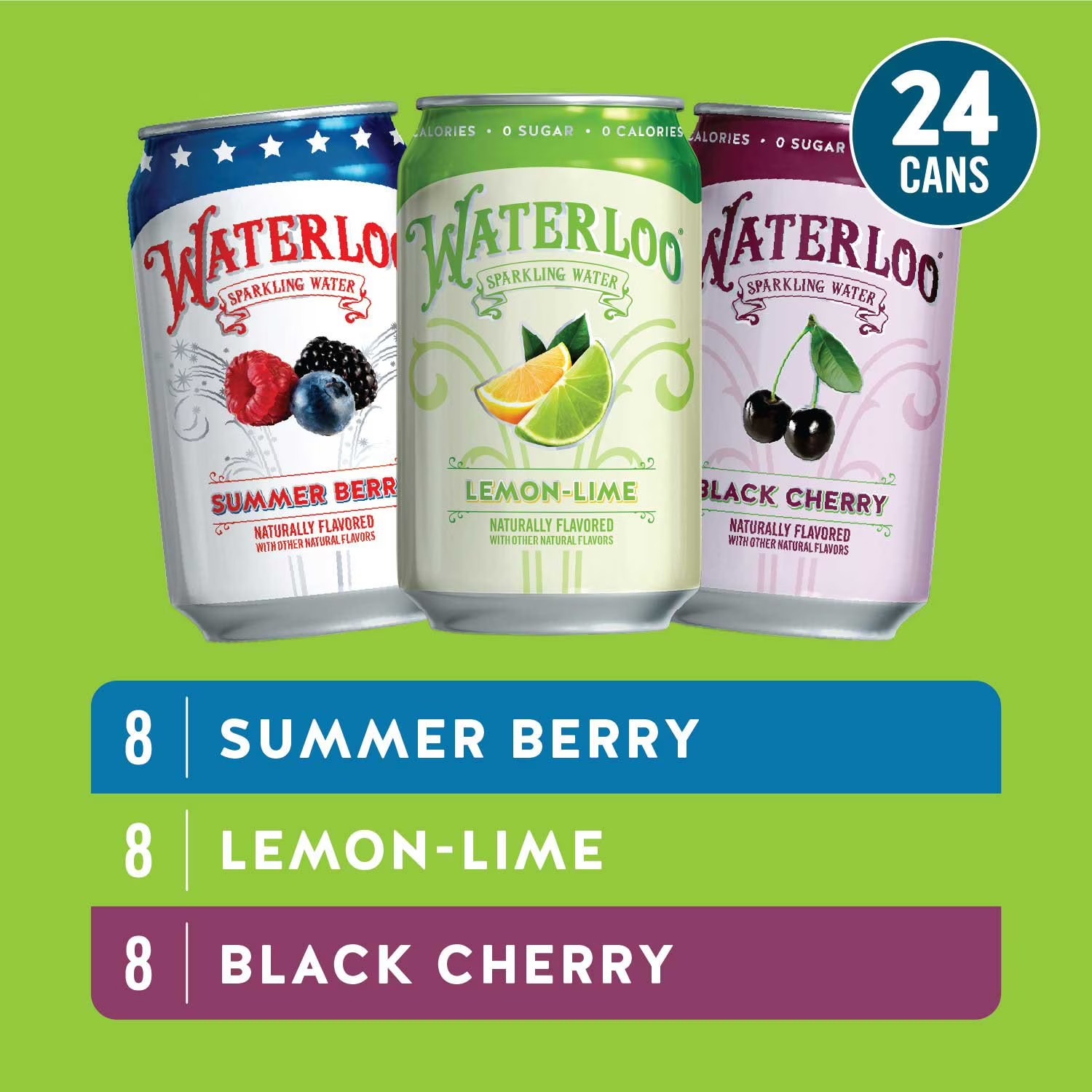 Quench your thirst with the Waterloo Sparkling Water Variety Pack. This pack includes 24 - 12-fluid-ounce cans, offering an exciting selection of flavors: eight cans of Waterloo Black Cherry Sparkling Water, eight cans of Waterloo Lemon-Lime Sparkling Water, and eight cans of Waterloo Summer Berry Sparkling Water. This diverse assortment gives you the chance to enjoy a different flavor every time you need a refreshing drink.