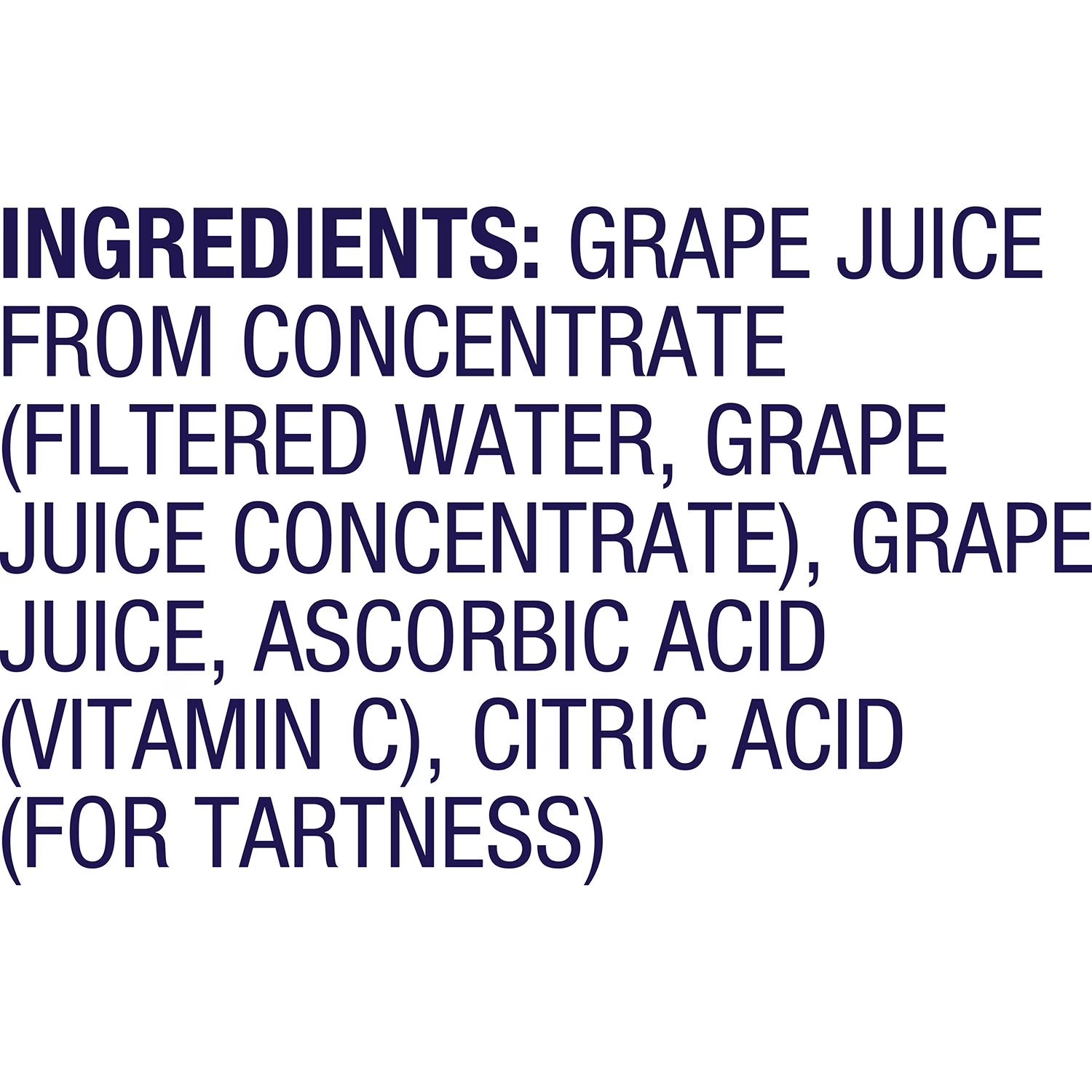 Ingredients: Grape Juice From Concentrate (Filtered Water, Grape Juice Concentreate), Grape Juice, Ascorbic Acid (Vitamin C), Citric Acid (For Tartness)