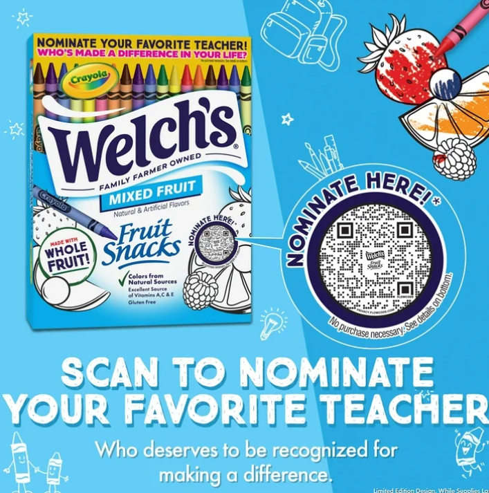 At Welch’s Fruit Snacks, we always put the most important thing first, like Whole Fruit as our Main Ingredient™. That’s why this back-to-school season, we are teaming up with Crayola to put teachers first, the real heroes of the season! Scan the QR code to nominate a teacher who has made a difference in your life and enter them for a chance to win fun prizes. Use Crayola markers, crayons or colored pencils to color the fruit on the front of the box & write a special note directly on the side panel for your teacher. Each convenient snack pack is individually portioned and ideal for lunchboxes, purses, backpacks, and desk drawers. Welch's Fruit Snacks are an excellent source of Vitamin C, A & E, contain no artificial dyes, and are both fat & gluten free, offering a feel-good option for everyday snacking. Whether you're grabbing a few snack packs or stocking up with a snack box, you’ll always have a delicious, family-favorite snack ready to go. With Welch's Fruit Snacks, snacking is simple, satisfying, and fun.