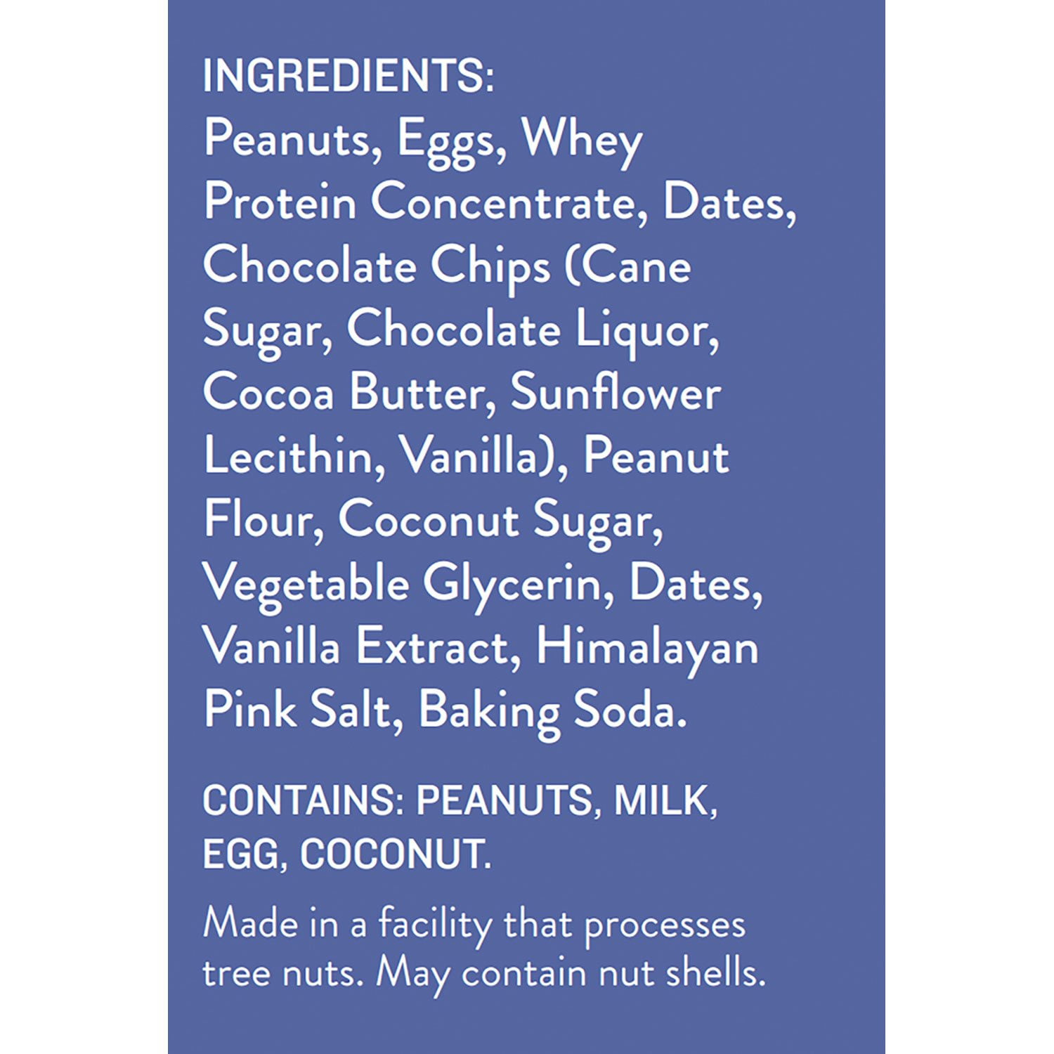 Ingredients: Peanuts, Eggs, Whey Protein Concentrate, Dates, Chocolate Chips (Cane Sugar, Chocolate Liquor, Cocoa Butter, Sunflower Lecithin, Vanilla), Peanut Flour, Coconut Sugar, Vegetable Glycerin, Dates, Vanilla Extract, Himalayan Pink Salt, Baking Soda.