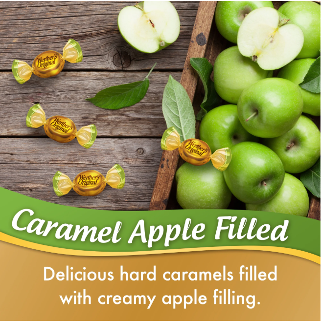 Our Werther's Original Caramel candy with a creamy apple flavored filling delivers a classic caramel apple flavor. Werther's Original creamy caramel filled candies feature a hard candy shell, with a smooth, melt in your mouth creamy filling in the center Werther’s Original is made with only the finest ingredients blended together with the same passion and care our first candy maker, Gustav Nebel, brought to every candy he crafted. Made with real butter and fresh cream, for a one of a kind taste. One 5.5 oz bag of Werther's Original hard filled caramels. 'allergens_not_contained'. Shellfish-Free