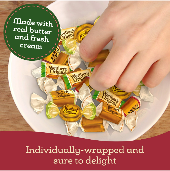 Werther’s Original Limited Edition Caramel Apple Hard Candies combine classic Werther’s caramel candy with the delicious flavor of caramel dipped apples. Werther’s caramels are made with only the finest ingredients: real butter, fresh cream, white and brown sugars, a pinch of salt and a lot of time. Still made with the same passion and care Gustav Nebel first brought to every Werther’s candy he crafted more than 100 years ago. These caramels are perfect for a candy treat on chilly autumn days, are a great complement to fall decor and Thanksgiving decorations and are an excellent choice to fill your Halloween candy bowl. Indulge in Werther’s Original Limited Edition Caramel Apple Caramels and enjoy the Werther’s caramels you love in the most craveable fall flavors you can imagine. Shellfish-Free.