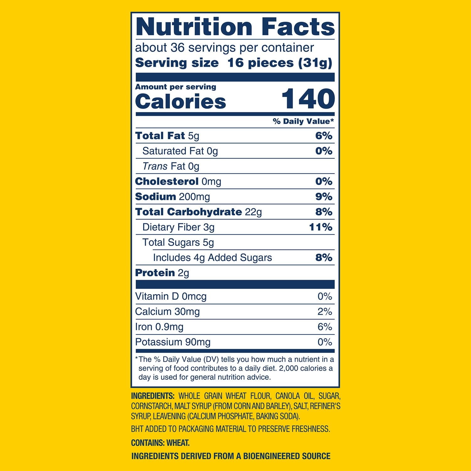 Ingredients: whole grain wheat flour, canola oil, sugar, cornstarch, malt syrup (from corn and barley), salt, refiner's syrup, leavening (calcium phosphate and baking soda). bht added to packaging material to preserve freshness. Contains wheat.