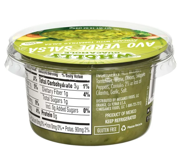 WHOLLY GUACAMOLE Avocado Verde Salsa Mild is made with tangy tomatillos, jalapeno peppers, garlic salt, cilantro, and chunky Hass avocados. This delicious dip is ready to go so you can enjoy the party whether it's a large gathering or a party of one. Mild Avocado Verde Salsa is great to have on hand to add to your favorite omelet, soups, salads, or sandwiches for a convenient addition to your favorite meal. Gluten-free, Non-GMO, and has no preservatives added. An ideal flavor enhancer to keep on hand in your refrigerator that makes a great topping for snacks or entrees. Includes one, 10 oz plastic bowl of WHOLLY GUACAMOLE Avocado Verde Salsa Mild. All trademarks, logos and images are owned by Hormel Foods Corporation, its subsidiaries and affiliates. Copyright MegaMex Foods, LLC
