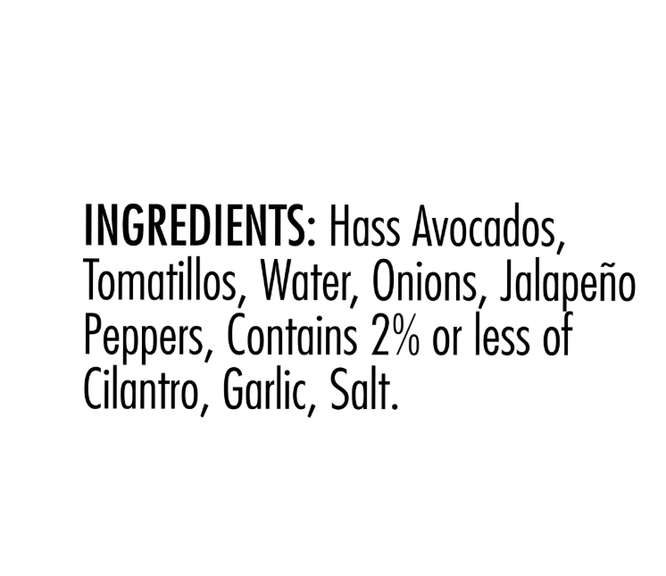 Hass Avocados, Tomatillos, Water, Onions, Jalapeño Peppers, Contains 2% or less of Cilantro, Garlic, Salt.