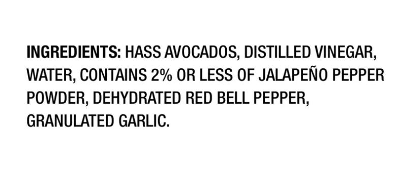 Hass Avocados, Distilled Vinegar, Water, Contains 2% or Less of Jalapeño Peppers, Dehydrated Onion, Salt, Jalapeño Pepper Powder, Dehydrated Red Bell Peppers, Granulated Garlic.