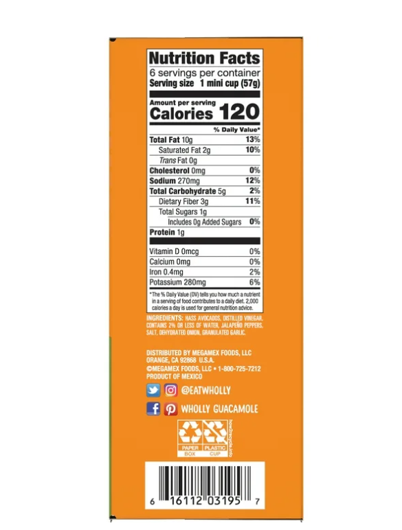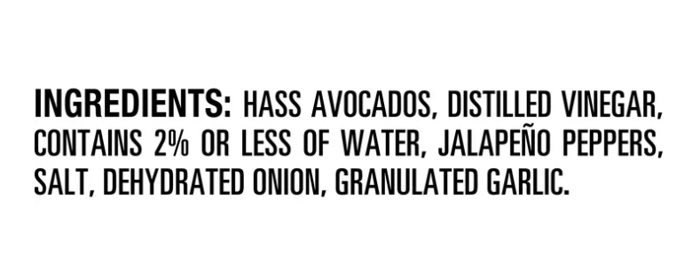Hass Avocados, Distilled Vinegar, Contains 2% or less of Water, Jalapeño Peppers, Salt, Dehydrated Onion, Granulated Garlic.