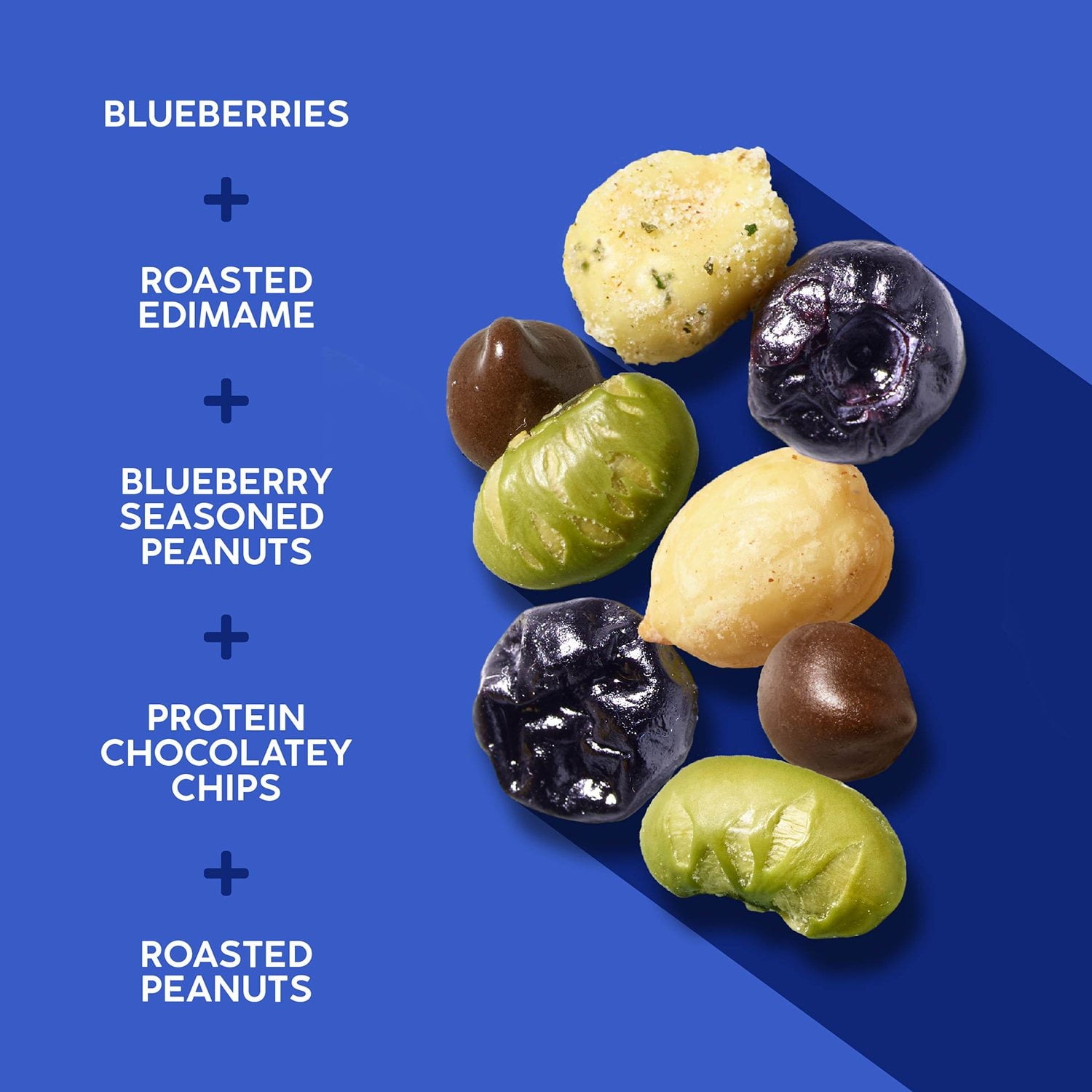 Ingredients: Protein chocolate flavored chips (milk protein isolate, sugar, palm kernel oil, cocoa processed with alkali, nonfat milk, soy lecithin, natural flavor, salt), blueberry flavored and seasoned peanuts (peanuts, seasoning [sugar, honey powder {maltodextrin, honey}, salt, spices, malic acid, natural flavor], high oleic sunflower oil), dry roasted peanuts (peanuts, salt), roasted edamame (soybeans, salt, soybean oil), dried blueberries (blueberries, sugar, sunflower oil). CONTAINS: Peanut, Soy, Milk.