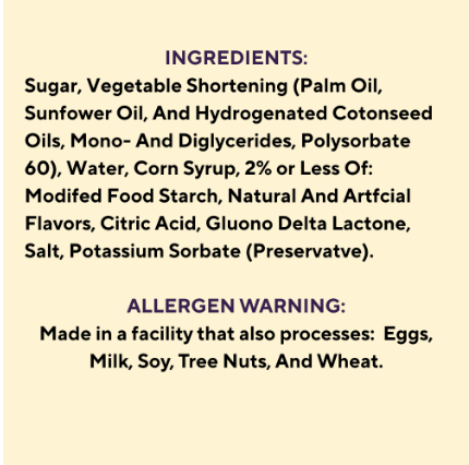 Sugar, Vegetable Shortening (Palm Oil, Sunflower Oil, and Hydrogenated Cottonseed Oils, Mono- and Diglycerides, Polysorbate 60), Water, Corn Syrup, 2% or Less of: Modified Food Starch, Natural and Artificial Flavors, Citric Acid, Glucono Delta Lactone, Salt, Potassium Sorbate (Preservative).