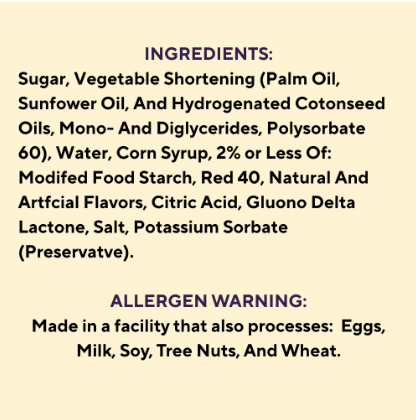 SUGAR, VEGETABLE SHORTENING (CONTAINS ONE OR MORE OF THE FOLLOWING: HYDROGENATED SOYBEAN OIL, SOYBEAN OIL, AND/OR HYDROGENATED COTTONSEED OIL), WATER, CORN SYRUP, CONTAINS LESS THAN 2% OF: CORN STARCH, MONO-AND DIGLYCERIDES, FD&C RED #40, NATURAL AND ARTIFICIAL FLAVOR, SALT, POTASSIUM SORBATE (PRESERVATIVE), SOY LECITHIN, POLYSORBATE 60, DEXTROSE, AGAR, CITRIC ACID, MIXED TOCOPHEROLS, ASCORBIC ACID.