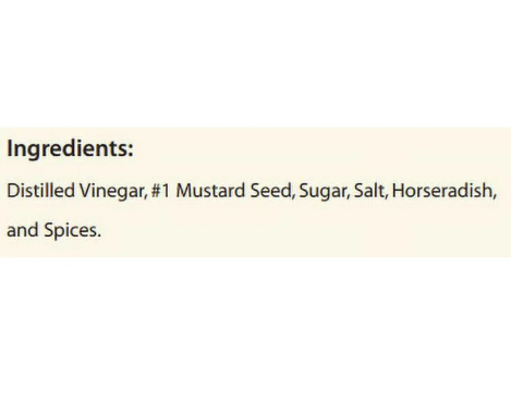 Distilled Vinegar, #1 Mustard Seed, Sugar, Salt, Horseradish, and Spices.