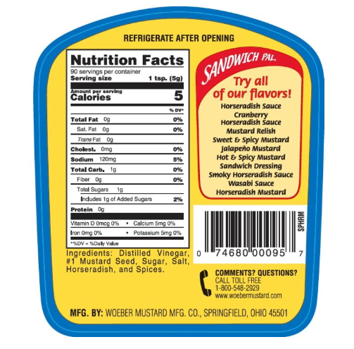Woeber’s Stone Ground Horseradish Mustard - A family recipe since 1905, this bold mustard delivers the perfect blend of spices and fresh horseradish. Coarse stone ground for rich texture, it’s the ideal companion for burgers, brats, sandwiches, and melts. With zero calories, no fat, no sugar, and no carbohydrates per serving, it’s a flavorful addition to any healthy lifestyle. Available at select Walmart stores nationwide.