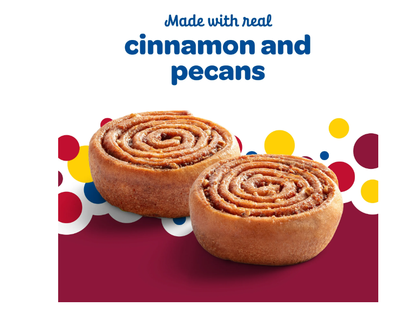 UNBLEACHED ENRICHED FLOUR (WHEAT FLOUR, MALTED BARLEY FLOUR, NIACIN, REDUCED IRON, THIAMIN MONONITRATE, RIBOFLAVIN, FOLIC ACID), WATER, SUGAR, VEGETABLE OIL (PALM OIL AND SOYBEAN OIL), CORN SYRUP, HIGH FRUCTOSE CORN SYRUP, YEAST, CONTAINS 2% OR LESS OF EACH OF THE FOLLOWING: CINNAMON, PECANS, SALT, MONOGLYCERIDES, CORN STARCH, SOY LECITHIN, DEXTROSE, NATURAL AND ARTIFICIAL FLAVOR, CALCIUM STEAROYL LACTYLATE, SODIUM STEAROYL LACTYLATE, ENZYMES, POLYSORBATE 80, WHEAT FLOUR, EGG YOLKS, CINNAMIC ALDEHYDE, COLORED WITH EXTRACTIVES OF TURMERIC AND ANNATTO SEED, EGGS, GUAR GUM, LEAVENING (BAKING SODA), PRESERVED WITH CALCIUM PROPIONATE AND SODIUM PROPIONATE.