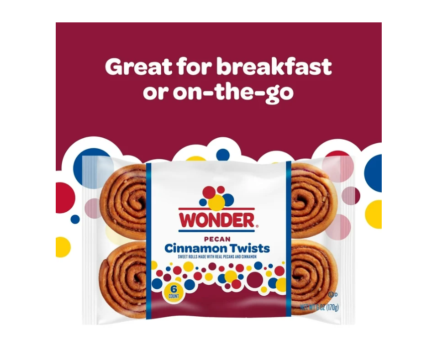 Wonder® Cinnamon Twists are made with real cinnamon and pecans, then baked to perfection. These shelf-stable pastries are made to be enjoyed morning, noon and night. Pair one or two of these pecan and cinnamon rolls with your morning coffee for breakfast or enjoy a few in the afternoon for a sweet snack. Wonder Cinnamon Twists conveniently come in a pack of six, making them the perfect shareable treat. These family-approved sweet treats are sure to provide you all the wonder you know and love. Made with Real Wonder. For over 100 years, the makers of Wonder Bread have been baking up that special taste that reminds us of our childhood and proves, time and time again, that the simple pleasures really are the best. Makes you Wonder what sweet memories the next 100 years will bring.