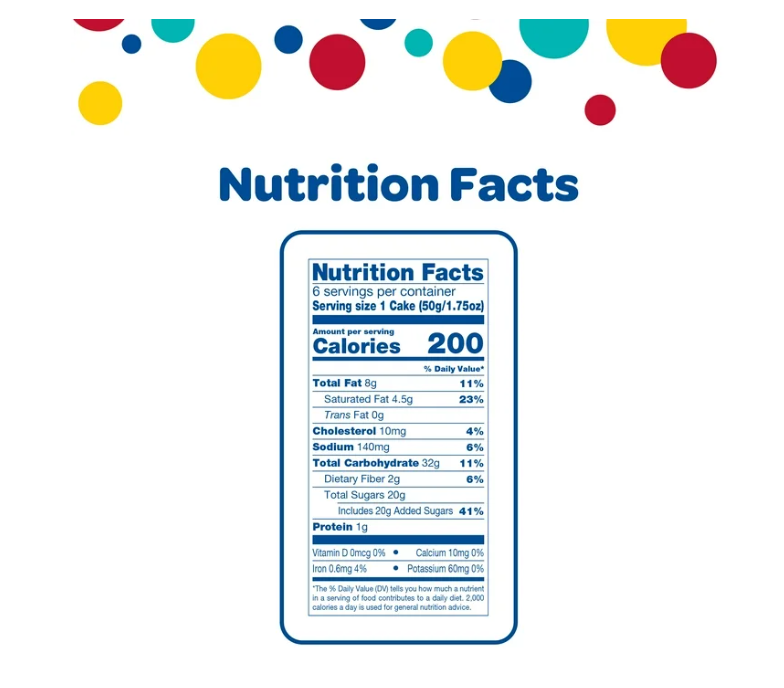 Sugar, Bleached and Unbleached Enriched Flour (Wheat Flour, Malted Barley Flour, Niacin, Reduced Iron, Thiamin Mononitrate, Riboflavin, Folic Acid), Water, Hydrogenated Palm Kernel Oil, Nonfat Milk, Vegetable Oil (Soybean Oil and Palm Oil), Eggs, Candy Sprinkles (Hydroxypropyl Methylcellulose, Red 3, Red 40, Yellow 5, Blue 1, Yellow 6, Gum Arabic, Sugar, Wheat Flour, Canola Oil, Wheat Starch, Red 40 Lake, Blue 2 Lake, Yellow 5 Lake, Yellow 6 Lake, Blue 1 Lake), Corn Syrup, High Fructose Corn Syrup, Contains 2% or Less of Each of the Following: Glycerine, Dextrose, Leavening (Sodium Acid Pyrophosphate, Baking Soda, Monocalcium Phosphate), Modified Corn Starch, Mono- and Diglycerides, Salt, Corn Starch, Corn Flour, Titanium Dioxide (Color), Sodium Stearoyl Lactylate, Soy Lecithin, Xanthan Gum, Natural and Artificial Flavors, Polysorbate 60, Sorbitan Monostearate, DATEM, Potato Starch, Monoglycerides, Wheat Flour, Citric Acid, Tricalcium Phosphate, Enzymes, Wheat Starch, Cellulose Gum, Wheat Gluten, Propylene Glycol Monoester, Ascorbic Acid, Sodium Alginate, Preserved with Potassium Sorbate and Sorbic Acid.