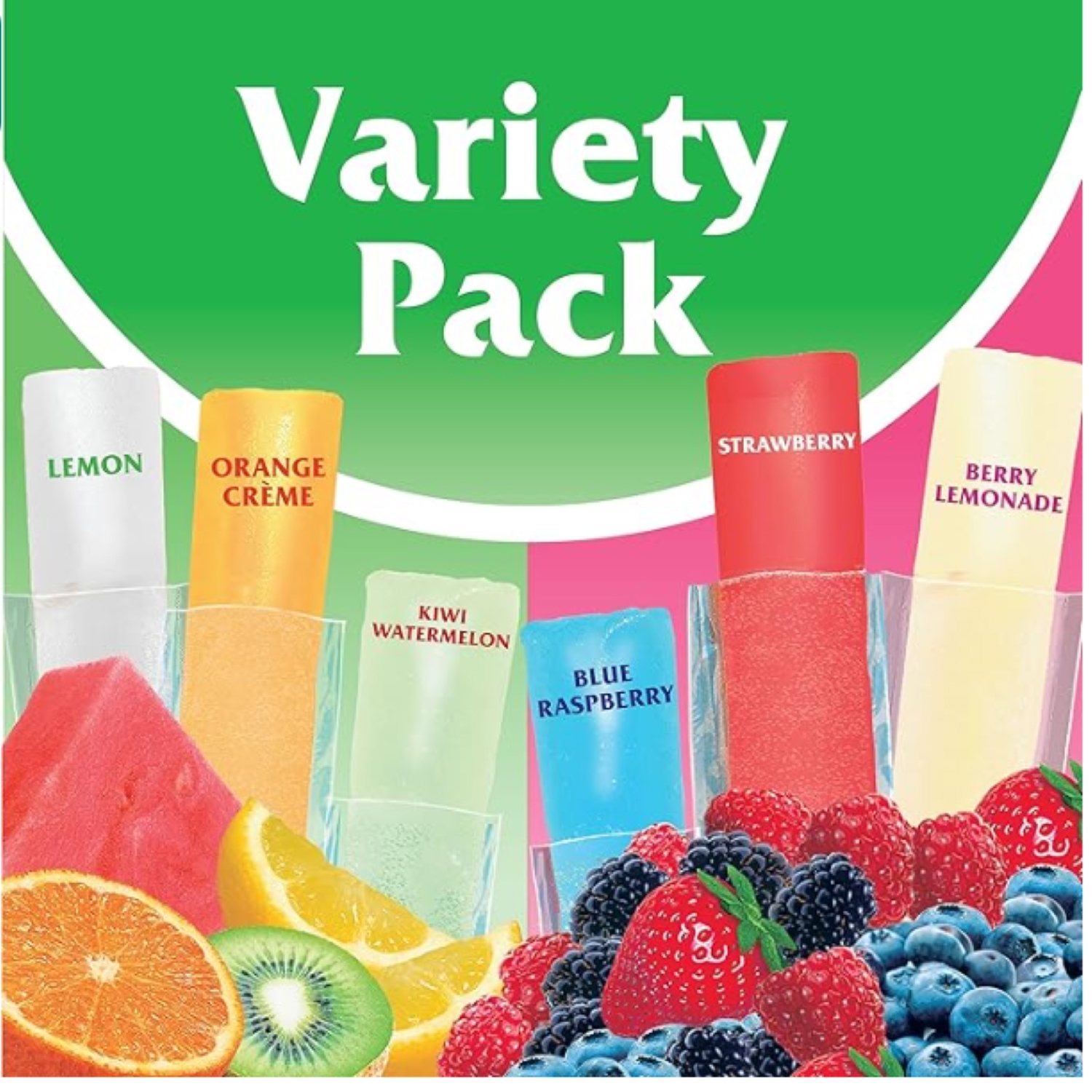 Includes: 96 packs, 2 oz. per pack, flavors included: Lemon, Orange, Kiwi Watermelon, Blue Raspberry, Berry Lemonade, Strawberry