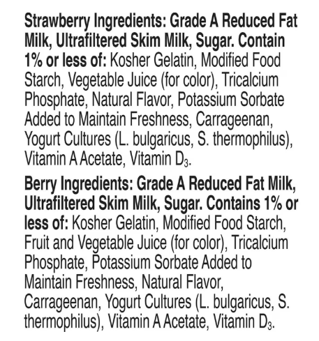 Berry Ingredients: Grade A Reduced Fat Milk, Ultrafiltered Skim Milk, Sugar. Contains 1% or Less Of: Kosher Gelatin, Modified Food Starch, Fruit And Vegetable Juice (For Color), Tricalcium Phosphate, Potassium Sorbate Added To Maintain Freshness, Natural Flavor, Carrageenan, Yogurt Cultures (L. Bulgaricus, S Thermophilus), Vitamin A Acetate, Vitamin D3
