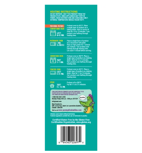 Yummy Dino Buddies Dinosaur Shaped Chicken Nuggets, now in a Gluten-Free version! Enjoy the amazing flavor of all-white meat chicken breast with no artificial ingredients, flavors or colors and no antibiotics. 530mg of Omega-3 and 9g of protein per serving. Serving size is 5 pieces or 85g. Fully cooked and microwaveable. For those who are struggling with wheat intolerance, Yummy Dino Buddies, Gluten Free Dinosaur Shaped nuggets will bring some happiness to your plate. Package size is 18 oz.