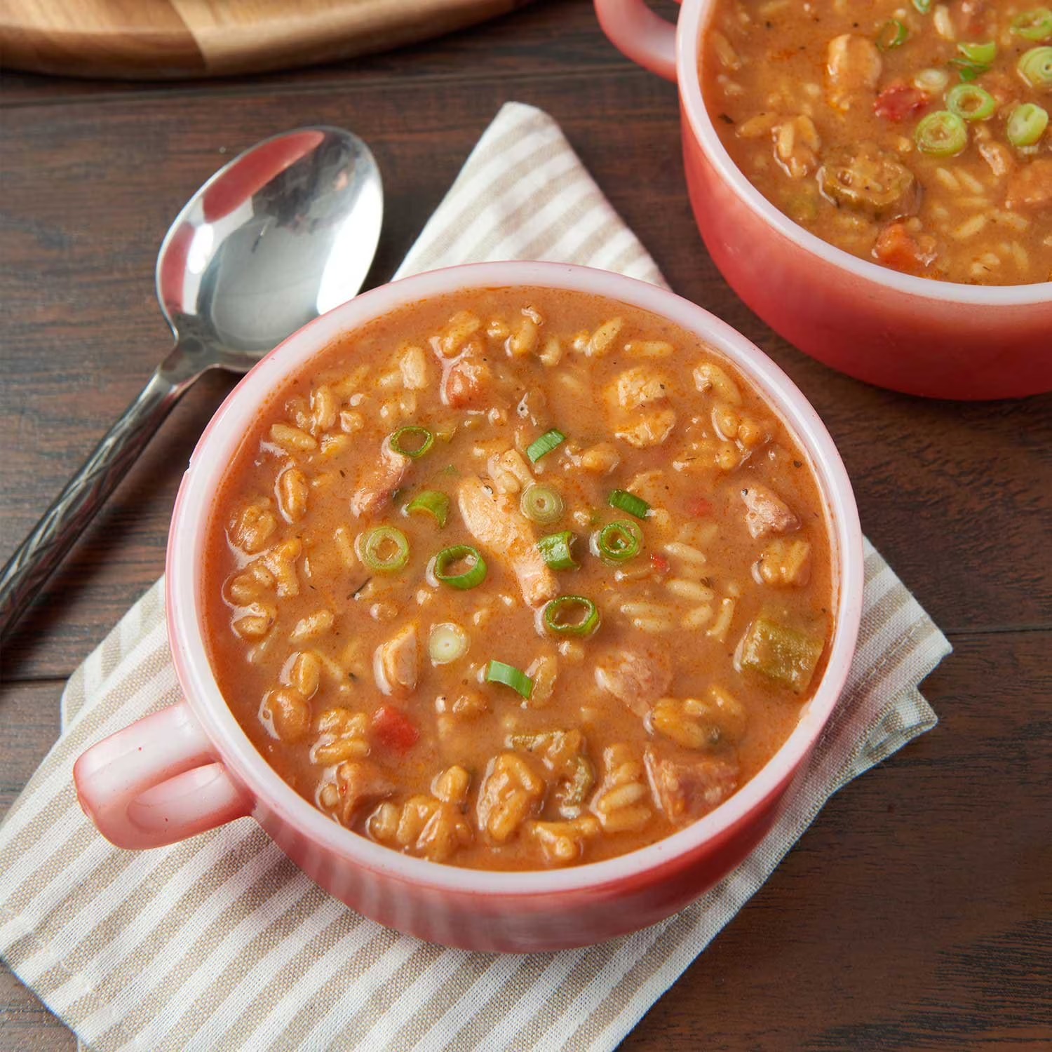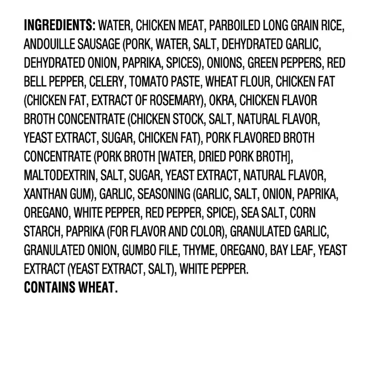 Water, Chicken Meat,Parboiled Long Grain Rice, Andouille Sausage (pork, water, salt, dehydrated garlic, dehydrated onion, paprika, spices), Onions, Green Peppers, Red Bell Pepper, Celery, Tomato Paste, Wheat Flour, Chicken Fat, Okra, Chicken Flavor Broth Concentrate (chicken stock, salt, natural flavor, yeast extract, sugar, chicken fat), Pork Flavored Broth Concentrate (pork broth [water, dried pork broth], maltodextrin, salt, sugar, yeast extract, natural flavor, xanthan gum), Garlic, Cajun Seasoning (garlic, salt, onion, paprika, oregano, white pepper, red pepper, spice), Sea Salt, Corn Starch, Paprika (for flavor and color), Granulated Garlic, Granulated Onion, Gumbo File, Thyme, Oregano, Bay Leaf, Yeast Extract (yeast extract, salt), White Pepper.
