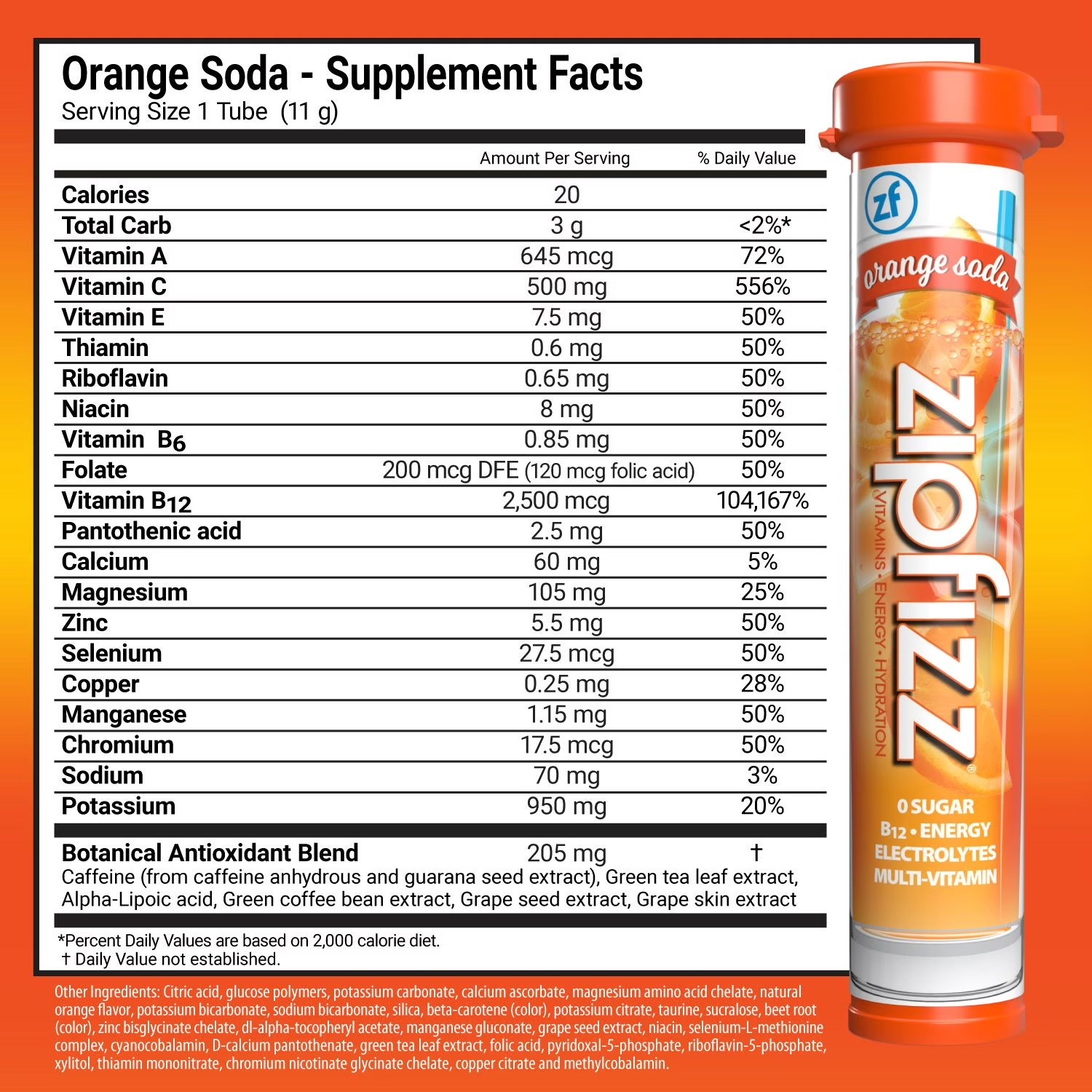 - Ingredients: Orange Soda Supplement Facts Servings: 20, Serving Size: 1 Tube (11 g), Amount per serving: Calories 20, Total Carb. 3 g (<2% DV), Vitamin A 645 mcg (72% DV), Vitamin C 500 mg (556% DV), Vitamin E 7.5 mg (50% DV), Thiamin 0.6 mg (50% DV), Riboflavin 0.65 mg (50% DV), Niacin 8 mg (50% DV), Vitamin B6 0.85 mg (50% DV), Folate 200 mcg DFE (120 mcg folic acid) (50% DV), Vitamin B12 2,500 mcg (104,167% DV), Pantothenic Acid 2.5 mg (50% DV), Calcium 60 mg (5% DV), Magnesium 105 mg (25% DV), Zinc 5.5 mg (50% DV), Selenium 27.5 mcg (50% DV), Copper 0.25 mg (28% DV), Manganese 1.15 mg (50% DV), Chromium 17.5 mcg (50% DV), Sodium 70 mg (3% DV), Potassium 950 mg (20% DV), Botanical Antioxidant Blend 205 mg: Caffeine (from caffeine anhydrous and guarana seed extract), Green tea leaf extract, Alpha-Lipoic acid, Green coffee bean extract, Grape seed extract, Grape skin extract. Other Ingredients: Citric acid, glucose polymers, potassium carbonate, calcium ascorbate, magnesium amino acid chelate, natural orange flavor, potassium bicarbonate, sodium bicarbonate, silica, beta-carotene (color), potassium citrate, taurine, sucralose, beet root (color), zinc bisglycinate chelate, dl-alpha-tocopheryl acetate, manganese gluconate, grape seed extract, niacin, selenium-L-methionine complex, cyanocobalamin, D-calcium pantothenate, green tea leaf extract, folic acid, pyridoxal-5-phosphate, riboflavin-5-phosphate, xylitol, thiamin mononitrate, chromium nicotinate glycinate chelate, copper citrate and methylcobalamin