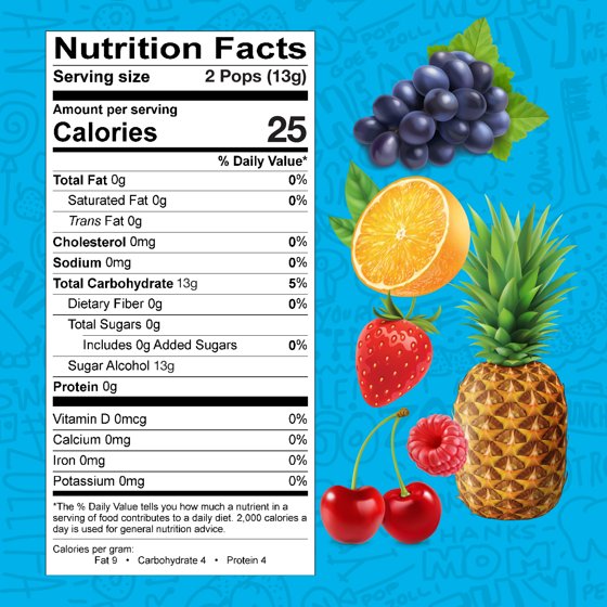 Zollipops Lollipops, Zolli Pops Zero Sugar Free Candy, Natural Fruit Flavor, Keto, Vegan, 5.2 Oz Zollipops candy treats are delicious with natural flavors and tooth-friendly ingredients. Zero sugar and artificial dye free great for Halloween trick or treating and school parties. Just when you thought life couldn’t get any sweeter - our sugar free candy is actually good for your teeth. How is this possible? Thanks to the unique blend of ingredients in Zollipops, Zolli Drops, and Taffy, our 100 percent zero sugar, sugar-free assorted candy helps reduce acidity, neutralize your mouth’s pH and may reduce the risk of tooth decay, dental caries and the future development of cavities. Best yet, your mouth feels cleaner and healthier after enjoying one of our keto candy treats. Zollipops sugar free fruit candy is not just for kids. Zollipops vegan candy assortment is for everyone that loves a clean, healthy smile, and is a great sugar free candy for diabetics. Having a Zollipops lollipop, Zolli Drops hard candy or Taffy (the yummiest zooey, gooey taffy on Earth) may just make you feel like a kid again! Keep smiling for years to come with our tasty treats that are mom and classroom approved. Zollipops is The After You Eat Treat for a healthy smile. A guilt-free treat perfect anytime, anywhere, as reward or an on-the go snacks. Sugary snacks can increase acidity in our bodies and mouths, and alkaline balance is very important to oral and bone health. Enjoying a zero-sugar candy treat from our bag of candy after a meal or snack, helps neutralize acidity in your mouth and gives teeth the time to re-mineralize. Dry mouth can also accelerate tooth decay, but Zollipops can help increase the production of saliva to help reduce dry mouth. Zollipops are made with plant based erythritol, xylitol, stevia and other smile friendly natural ingredients that are actually good for your teeth. They are nut-free, sugar free, non-GMO, gluten free, dairy-free*, vegan* and kosher. All colors are from natural plant-based sources. (*Zolli Caramels contains dairy products. Xylitol is not safe for pets.) Zollipops, Zolli Drops, and Taffy go hand-in-hand with parties and holidays, as each pack comes in a convenient re-sealable pouch. It's great Valentine's candy, Halloween, Easter and Christmas candy, or an any-day fun party candy. Keep everyone smiling at your next event with Zollipops zero sugar, sugar free candy,