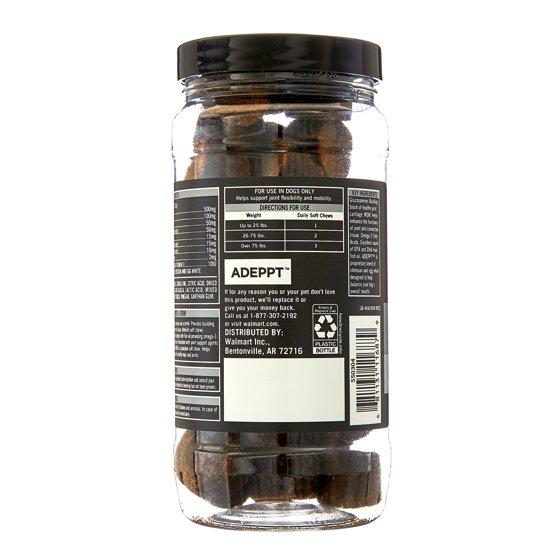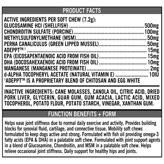 Glucosamine HCl (Shellfish): 500 mg, Chondroitin Sulfate (Porcine): 100 mg, MSM (Methylsulfonylmethane): 50 mg, Perna Canaliculus (Green-Lipped Mussel): 50 mg, ADEPPT™ Proprietary Blend (Chitosan and Egg White): 15 mg, EPA (Fish Oil): 15 mg, DHA (Fish Oil): 10 mg, Manganese: 2 mg, d-Alpha Tocopheryl Acetate (Vitamin E): 10 IU, Cane molasses, canola oil, citric acid, dried pork liver, glycerin, guar gum, gum acacia, lactic acid, mixed tocopherol, potato flour, potato starch, vinegar, xanthan gum