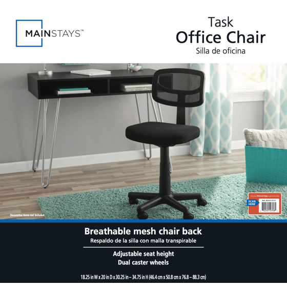 The Mainstays Mesh Task Chair offers a blend of comfort, support and mobility. The backrest and seat cover are made of a lightweight breathable black mesh fabric upholstery. The high backrest provides sturdy support for your back while the generously padded seat adds another layer of contoured comfort during those long workdays. Easily adjust the height of your chair with the convenient pneumatic lift lever to customize chair to fit you. A durable five-star black nylon plastic base will withstand years of wear and tear with a textured finish. Durable dual caster wheels roll smoothly around the room and are built to last. It pairs well with a variety of desk styles from contemporary to modern and everything in between. Compact design makes this a great chair for any space big or small. Whether in a cubical, home office or dorm room the Mainstays Mesh Task Chair provides the contemporary style and functionality you need.