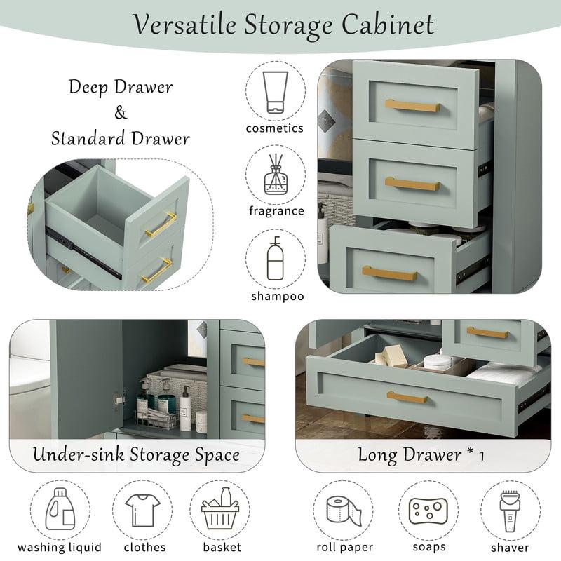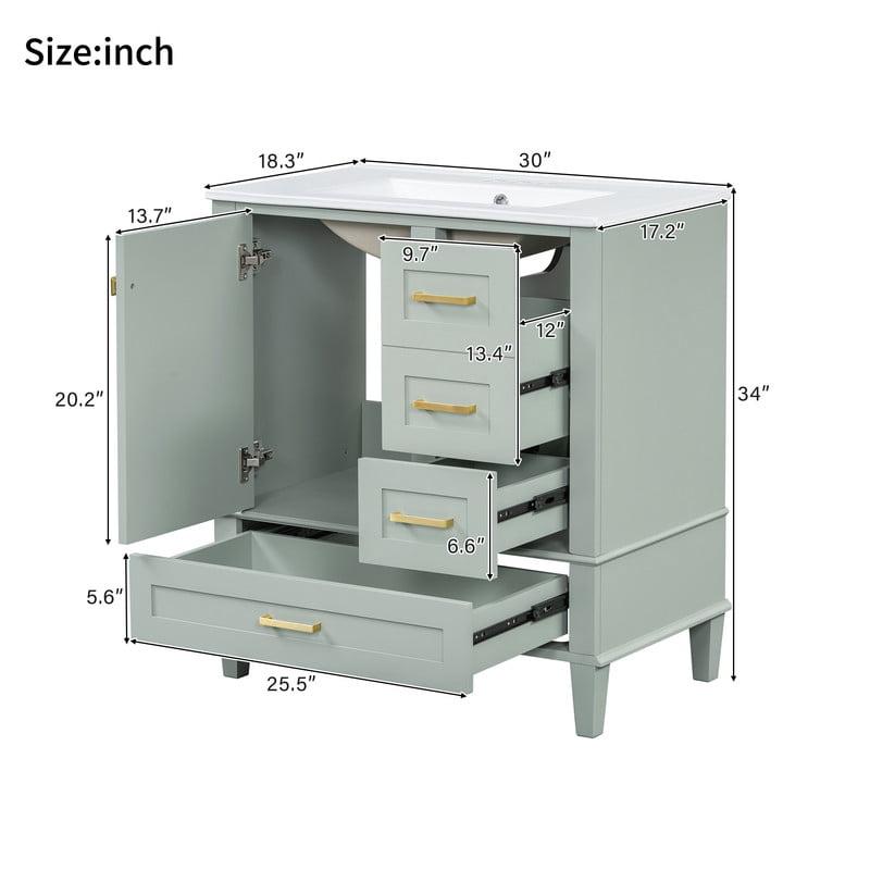 🛁【Sturdy Bathroom Vanity with Top】: Enhance your bathroom's aesthetic with this stylish 30 inch bathroom vanity. The refreshing light green cabinet paired with a white ceramic top creates a vibrant look, while the sleek lines and metallic handles add a modern touch. It serves as a beautiful focal point in any bathroom remodel or update, complementing various decor styles.
