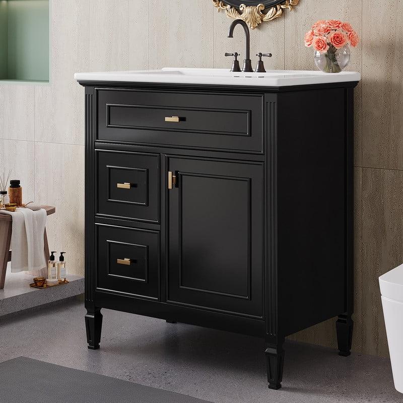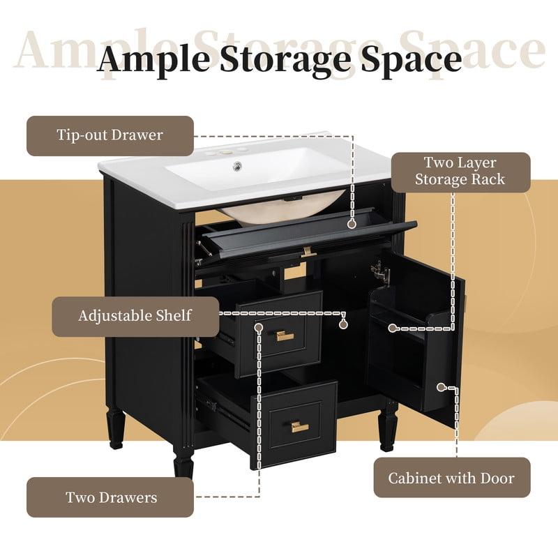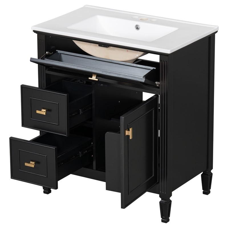 30" Bathroom Vanity with Sink, 30 in Vanities with Ceramic Sink, Single Sink Bathroom Vanity with 1 Flip Drawer, 2 Drawers & Adjustable Shelf (Black)