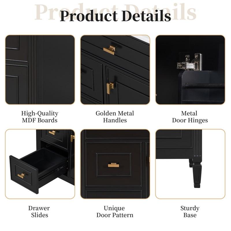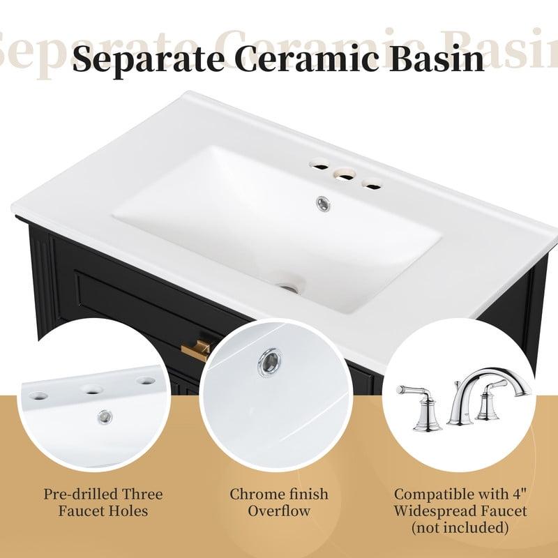 【Premium Bathroom Vanity with Sink 30 Inch】:Enjoy peace of mind with the practical design of this 30 inch vanity with sink. The high-quality ceramic basin includes a built-in overflow system with a stylish metal ring, preventing accidental water spills. Pre-drilled for an 8" widespread faucet (sold separately), this vanity 30 inch combines elegant style with intelligent functionality to keep your bathroom floor safe and dry.