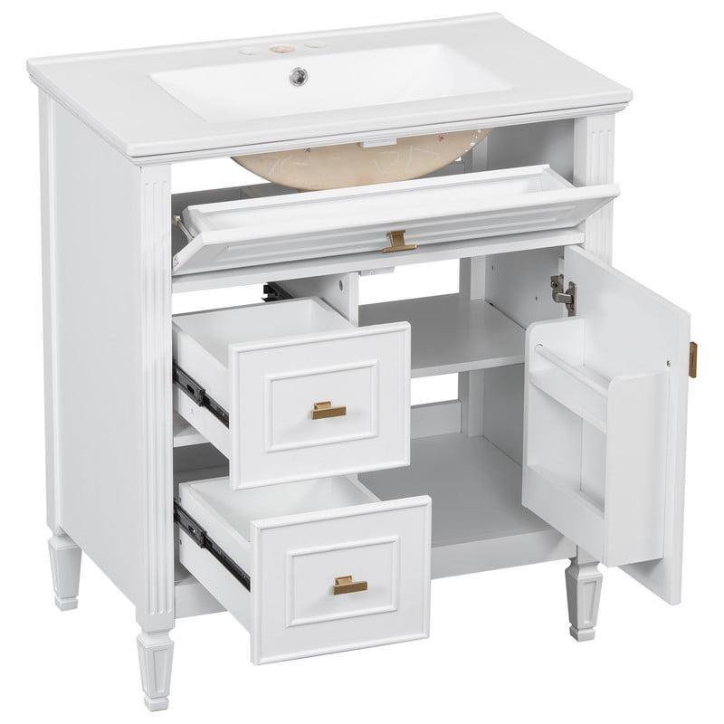 30" Bathroom Vanity with Sink, 30 in Vanities with Ceramic Sink, Single Sink Bathroom Vanity with 1 Flip Drawer, 2 Drawers & Adjustable Shelf (White)