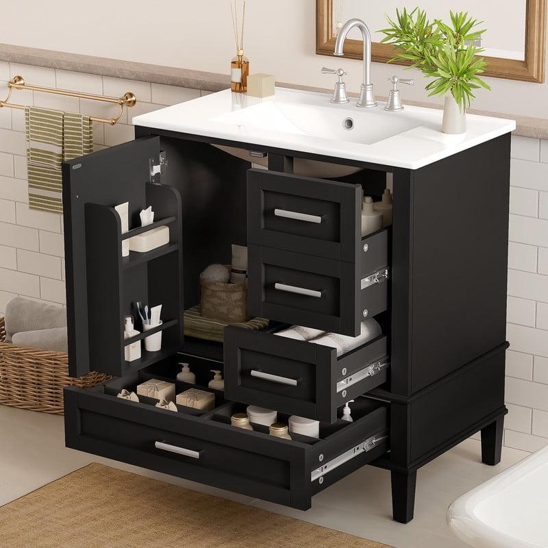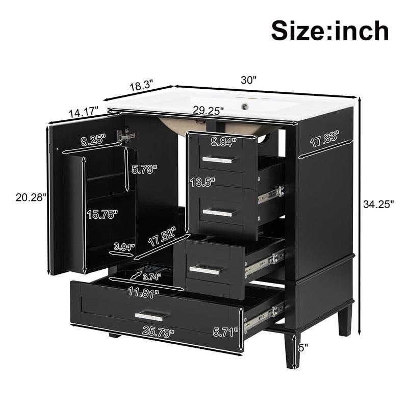 Stylish 30" Bathroom Vanity –This 30 inch bathroom vanity includes a high-quality ceramic sink with overflow protection, preventing water spills and ensuring safety. The pre-drilled 3 holes on the top is available to 4" center-set faucet (not included). Besides, there is a anti-spill hole to prevent water from overflowing when you forgot to turn off the tap.