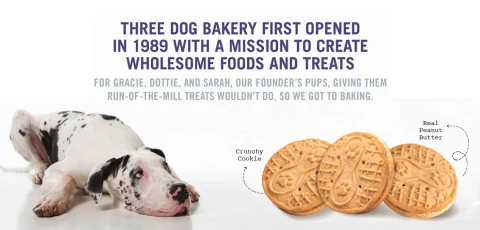 - Three Dog Bakery treats & cookies are crafted with love and real ingredients like peanut butter
