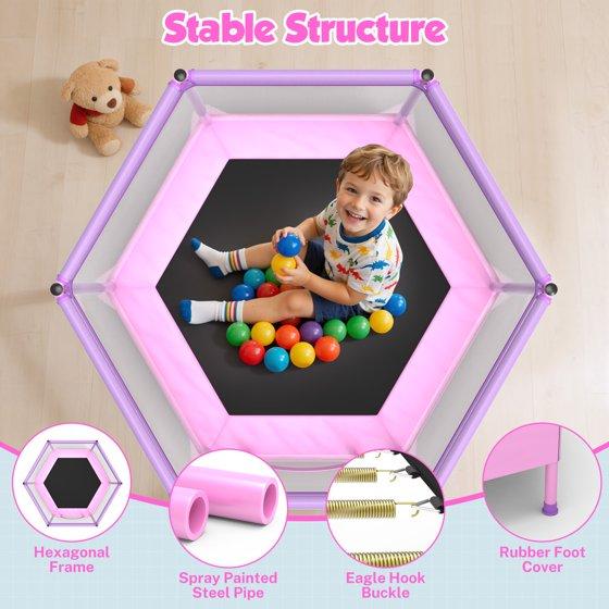 - Package Includes: 1 Hexagonal Kids Trampoline, 15 Ocean Balls, 1 Accessories Bag, 1 Instruction Manual